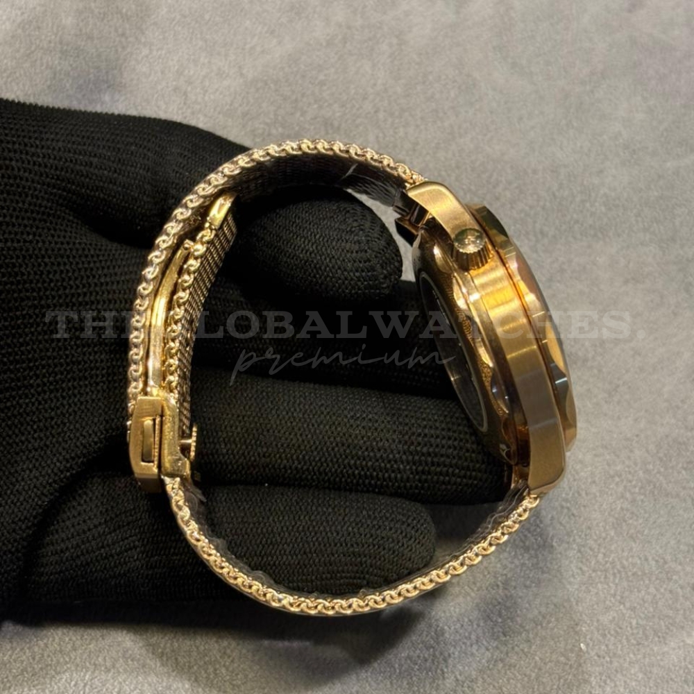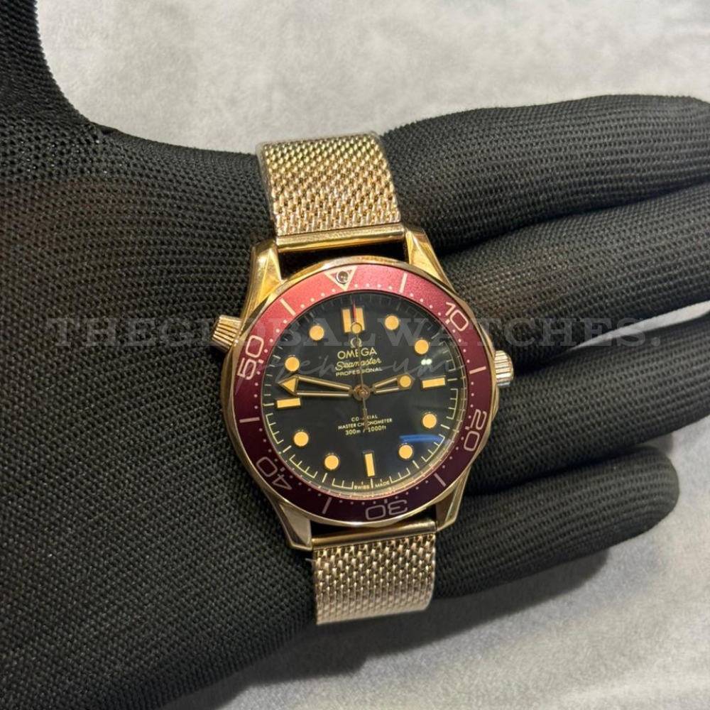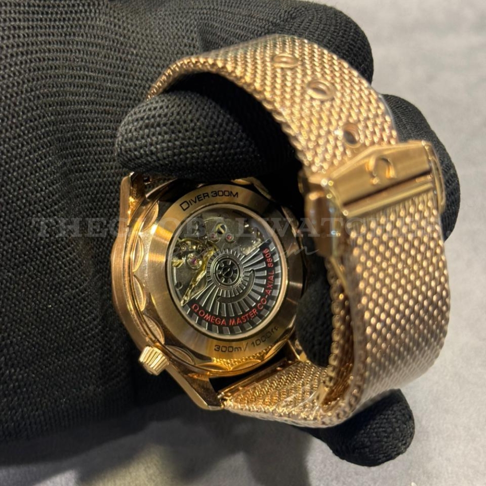 The bronze gold mesh bracelet not only enhances comfort but also gives the Seamaster a distinguished vintage charm. The combination of warm metallic tones and modern design creates a seamless balance between classic and contemporary style. It feels substantial yet light on the wrist, making it suitable for both professional settings and leisure outings.