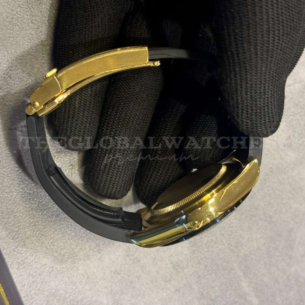 The Oysterflex rubber strap offers durability and comfort, making it ideal for active lifestyles. Designed with flexibility in mind, it fits naturally on the wrist while maintaining a luxurious appearance. The solid gold case back and crown add a refined finishing touch, reflecting Rolex-inspired quality and elegance.