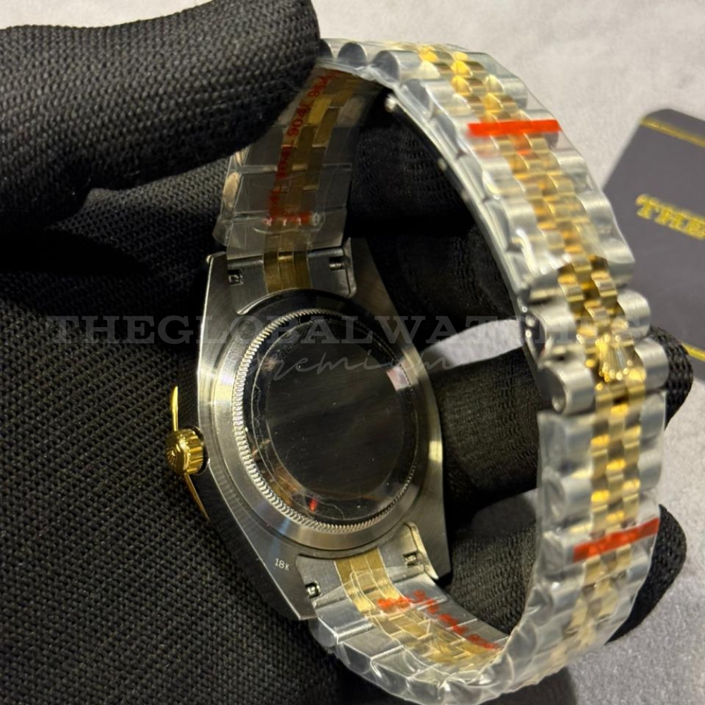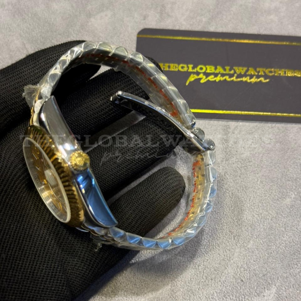 The sun-brushed champagne dial complements the two-tone steel and gold finish perfectly. Large luminous hour markers ensure readability, and the distinctive 24-hour ring at the center enhances both style and practicality. This watch balances luxury aesthetics with everyday usability, making it perfect for both professional and social occasions.
